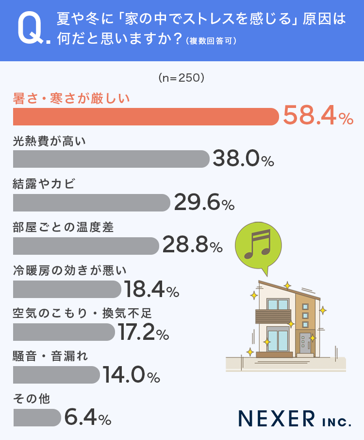 最も多かったのは「暑さ・寒さが厳しい」で58.4%でした。次いで「光熱費が高い」が38.0%、「結露やカビ」が29.6%、「部屋ごとの温度差」が28.8%と続きます。