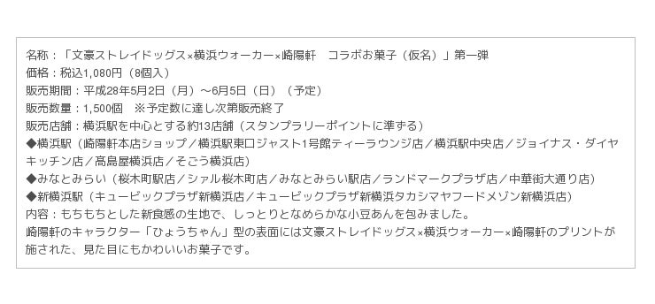 TOKYO MX、tvkほかでテレビアニメ放送中の「文豪ストレイドッグス」と「横浜ウォーカー」、「崎陽軒」のコラボレーション企画として崎陽軒の公式キャラクター「ひょうちゃん」型の新しいお菓子を、文豪ストレイドッグス武装探偵社のメンバーがデザインされた限定コラボ缶に入れて2016年5月2日(月)に期間・数量限定で崎陽軒店舗にて発売いたします。