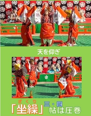 9つの組曲で場面ごとに舞人が綾をなす華やかさは、現代に伝える「舞楽(ぶがく)」の集大成で、4人が花のように輪になって周る「座繰(ざぐり)」は圧巻です。