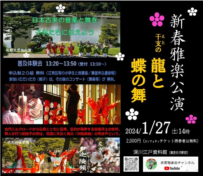 チケットを購入いただくと、前日2024年1月27日 (土)14時開催の多度雅楽会主催『新春雅楽公演 龍と蝶の舞』深川江戸資料館(東京都江東区白河1丁目3-28)も無料でご覧いただけます。(チケットを当日持参してご提示ください。)