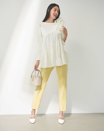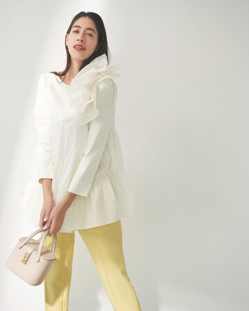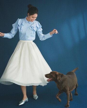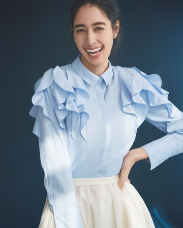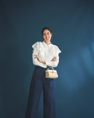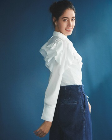 比翼開きのホワイトシャツにふんだんにラッフルをあしらい、ノーブルな華やかさを表現。ハイウエストのきれいめデニムにインするとバランスよく、脚長効果も期待できます。