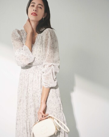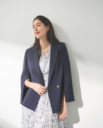 細やかな表面感が特徴の繊細なマジョリカプリーツ加工を施したプリントワンピースでフェミニンスタイルに。きちんと感のあるジャケットを羽織れば、甘さの調節も自在に行えます。