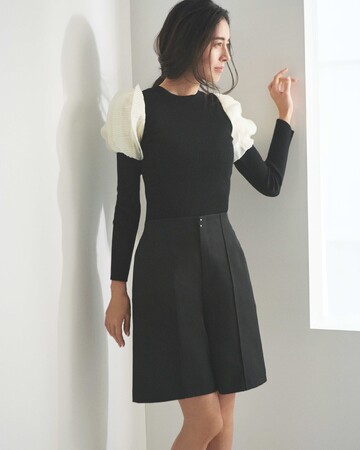黒ニットに、透け感のあるプリーツフリル袖の異素材ミックスが映えるプルオーバー。モノトーンを効果的に使い、周りから一目置かれるおしゃれ上級者の装いに。