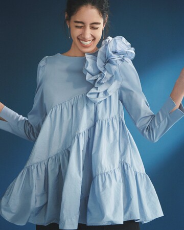 デイリーシーンに品格を添える、美しいブルーが印象的。体を包み込むように広がるティアードのプルオーバーが、動きに合わせて生き生きとしたラインを描き出します。