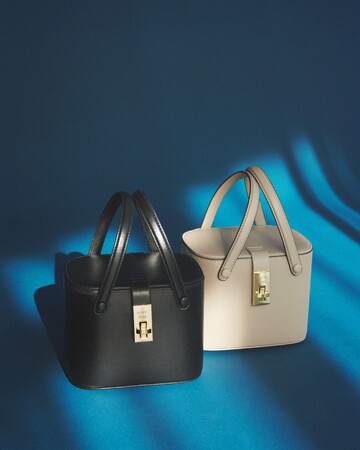 「張りこみ」と呼ばれるクラシックな手法を用い、現代的かつ洗練されたボックス型デザインに仕立てたハンドバッグ。きらりと光るロゴ入り金具がアクセントです。