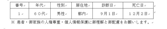 都内で新型コロナウイルスに感染した方が死亡されましたのでお知らせします。
