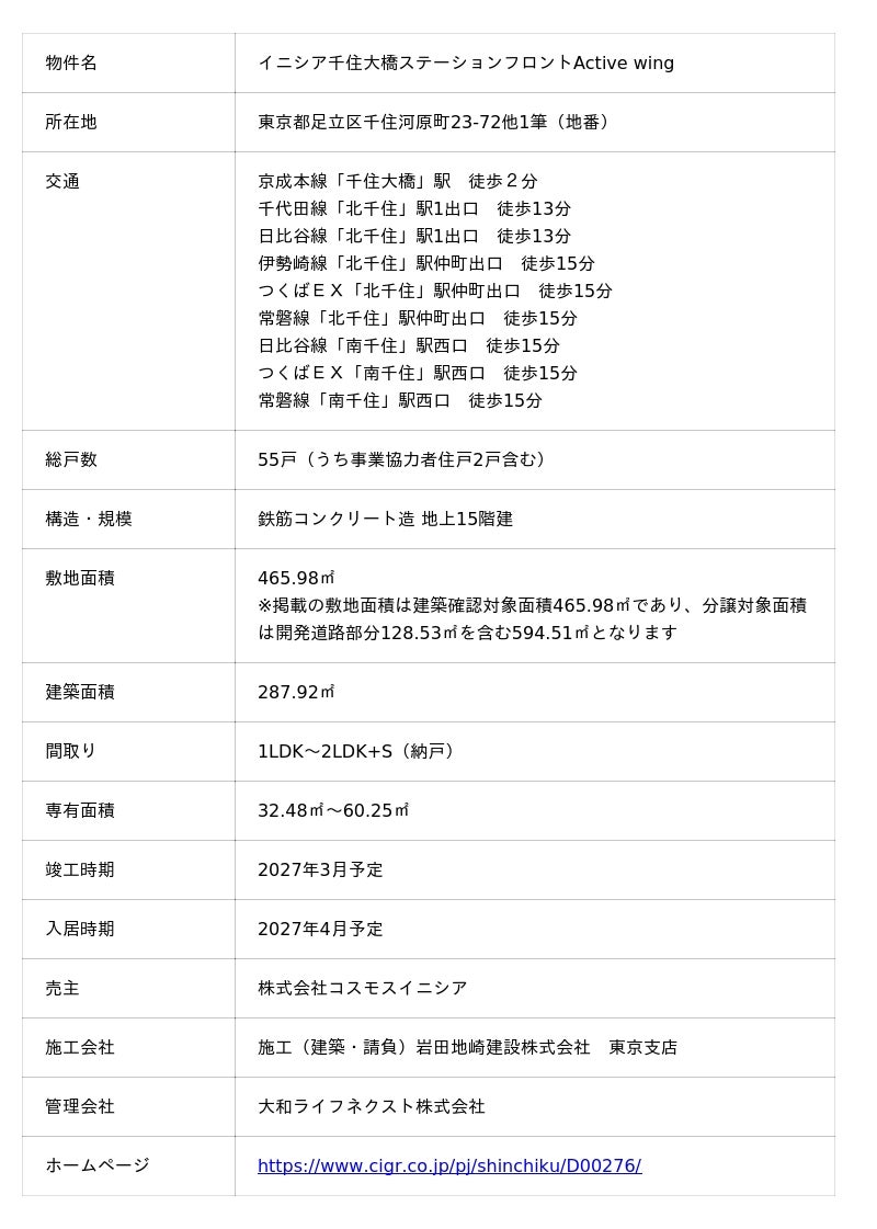 大和ハウスグループの株式会社コスモスイニシア(本社:東京都港区、社長:高智 亮大朗)は、新築分譲マンション『イニシア千住大橋ステーションフロントActive wing』・『イニシア千住大橋ステーションフロントBright wing』(東京都足立区、地上15階建、Active wing55戸(うち事業協力者住戸2戸)、Bright wing68戸)の第1期1次の登録販売受付を2026年2月20日(金)から開始しました。(※1)