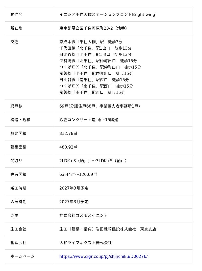 新築分譲マンション『イニシア千住大橋ステーションフロントActive wing』『イニシア千住大橋ステーションフロントBright wing』第1期1次販売開始(ニュースリリース)