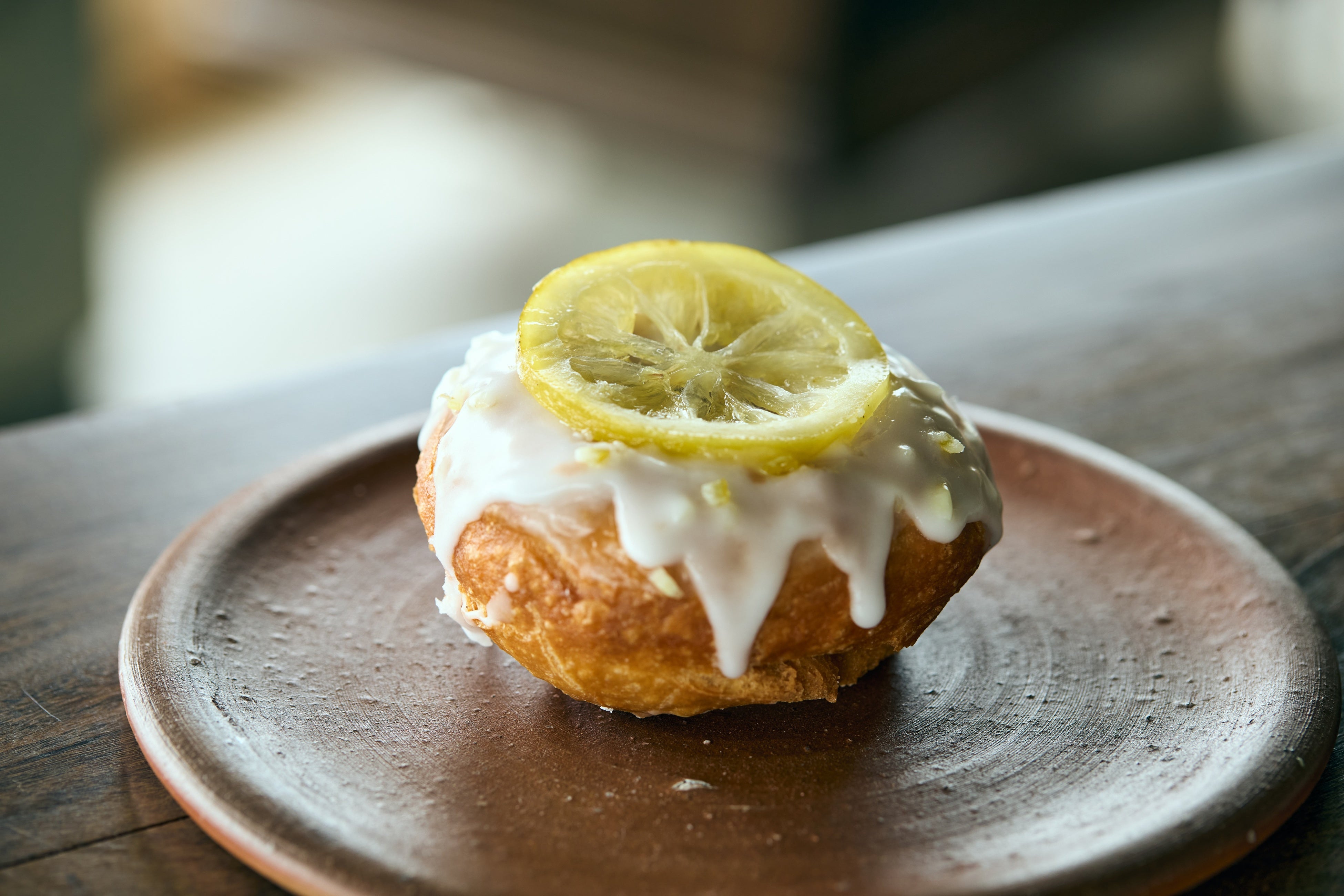 「レモンのドーナツ」は、水と小麦を混ぜ天然酵母により自然発酵した生地「サワードウ」のドーナツをアイシングし、レモンピールをトッピングした定番スイーツ。レモンピールのほろ苦さと甘酸っぱさが、ドーナツの風味とよく合います。