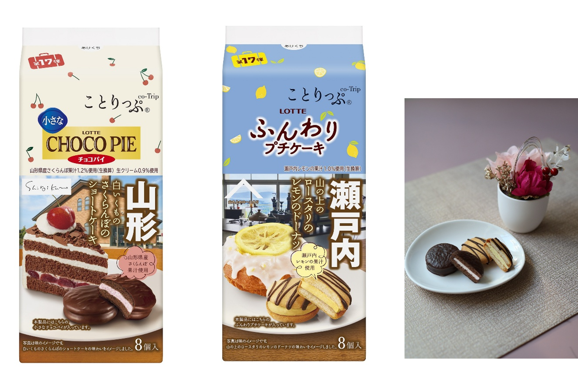 今回のテーマは、地元で愛される名店が提供する「県産フルーツ使用の人気メニュー」。山形県南陽市と米沢市にある人気パティスリー「白いくも」の「さくらんぼのショートケーキ」の味わいを表現した「ことりっぷ 小さなチョコパイ<白いくものさくらんぼのショートケーキ>」と、岡山県瀬戸内市にある珈琲専門店「山の上のロースタリ」の「レモンのドーナツ」の味わいを表現した「ことりっぷ ふんわりプチケーキ<山の上のロースタリのレモンのドーナツ>」が登場します。