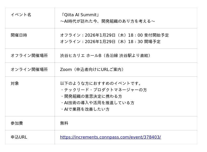 「Qiita AI Summit」は、このような課題意識を持つ皆さまに向けて、AI時代に「闘える開発組織づくり」を追求するとともに、その変革を支える最先端の技術や具体的なソリューション、採用戦略などの議論を深めるための場です。本イベントは、参加者の皆さまが目指すべき開発組織のあり方について考えを深め、実践的な知見を得られる機会を提供します。