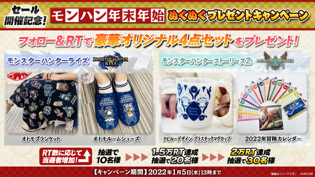 おうちで温まるグッズなどが当たる「モンハン年末年始ぬくぬくプレゼントキャンペーン」を実施中! さらに『モンスターハンターライズ』の新TVCMも公開。