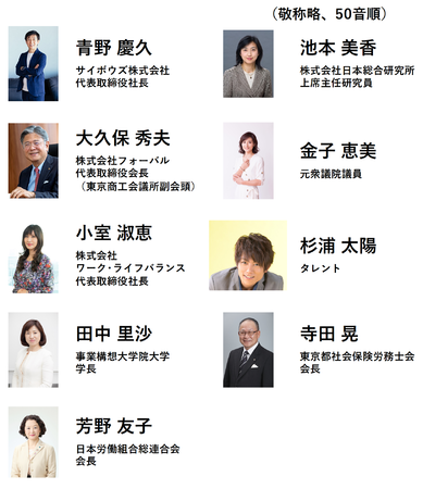 (敬称略、50音順)青野 慶久(サイボウズ株式会社代表取締役社長)/池本 美香(株式会社日本総合研究所上席主任研究員)/大久保 秀夫(株式会社フォーバル代表取締役会長(東京商工会議所副会頭))/金子 恵美(元衆議院議員)/小室 淑恵(株式会社ワーク・ライフバランス代表取締役社長)/杉浦 太陽(タレント)/田中 里沙(事業構想大学院大学学長)/寺田 晃(東京都社会保険労務士会会長)/芳野 友子(日本労働組合総連合会会長)