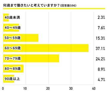 まずは人生100年時代において、何歳まで働き続けたいかを聞いたところ、「60-69歳まで」と回答した人が最多で約4割。「70-79歳まで」「80-89歳まで」「90-99歳まで」という回答も数字を伸ばし、70歳以降も働き続けることを希望する人が合計約4割となりました。