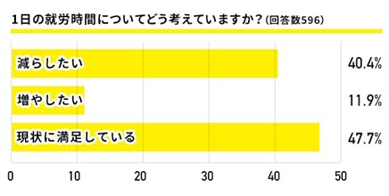 健康維持に影響してくると考えられる要素の一つが就労時間。比較的に時間が自由になるイメージのあるフリーランスですが、就労時間は「7-9時間」がトップ。一般的な会社員と就労時間は大きく変わらないことがわかりました。また、現在の就労時間については「現状に満足している」がトップで約5割となりました。