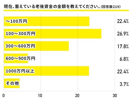 蓄えている老後資金の金額については「100-300万円」がトップ、そして「100万円以下」と「1,000万円以上」が同率で次点となりました。それと比べて中間の「300-600万円」「600-900万円」は数字が大きくは伸びず、老後資金の金額は二極化傾向にあることがわかりました。