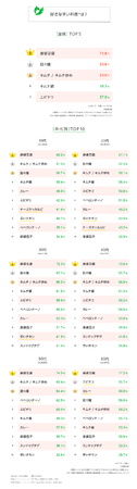 全体1位は「麻婆豆腐」で7割超。全体2位以降は、「担々麺」「キムチ / キムチ炒め(豚キムチなど)」が6割台で続きます。