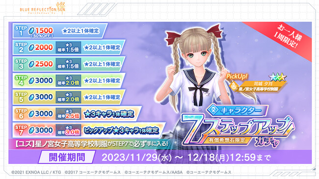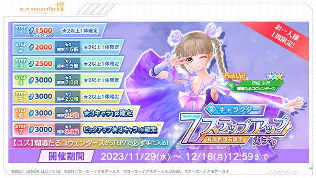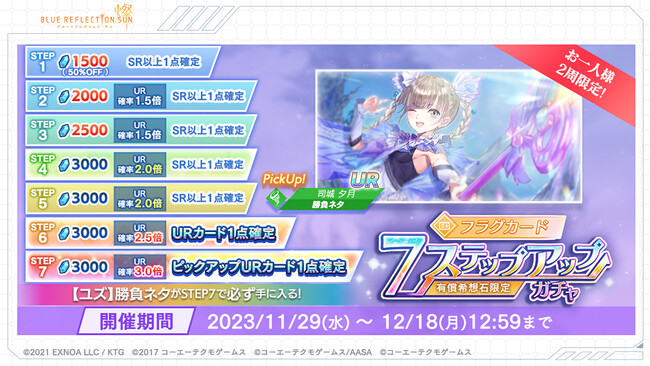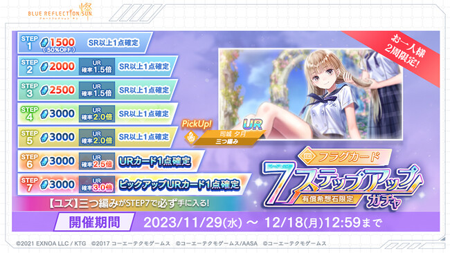 有償希想石で10連ガチャを引くごとにSTEPが1つアップ!STEP7では、それぞれのガチャで★3キャラクター/URフラグカードの出現確率が3倍になるほか、ピックアップ★3キャラクター1体/URフラグカード1枚が確定でゲットできます!