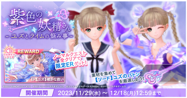 合同会社EXNOA(本社:東京都港区、CEO:村中 悠介、URL:https://games.dmm.com)が運営するDMM GAMESは、スマートフォン/PC向けヒロイックRPG『BLUE REFLECTION SUN/燦』にて、新イベント「紫色の妖精さん ~ユズとライムの悩み事~」を開催したことをお知らせいたします。