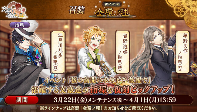 召装『金環ノ理』のラインナップを更新いたしました。この召装では、イベント『調査任務「桜の満開の木の下で 後編」』で活躍する「岩野泡鳴」「夢野久作」「江戸川乱歩」の指環を一定の確率で入手できます。