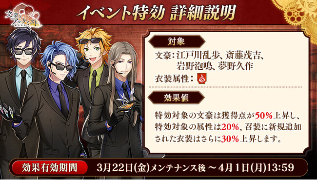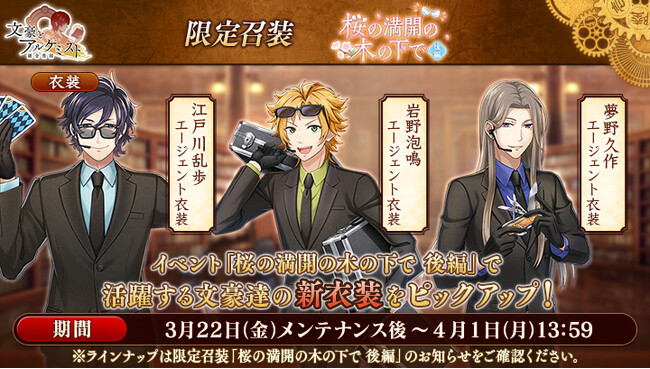さらに、イベントと同時に開催される限定召装『桜の満開の木の下で 後編』にて新規追加された「岩野泡鳴」「夢野久作」「江戸川乱歩」の〈エージェント衣装〉を編成すると、得点の獲得率がそれぞれ30%上昇します。