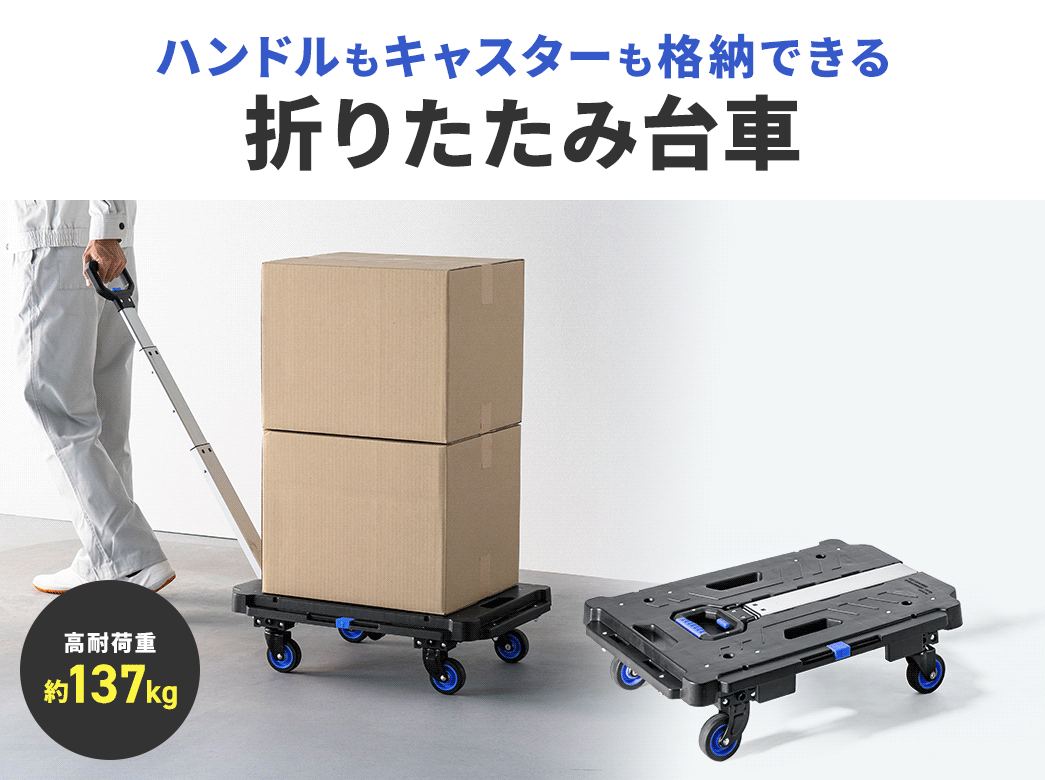 ●ハンドルとキャスターを格納できて耐荷重137kgまでに対応した台車です。