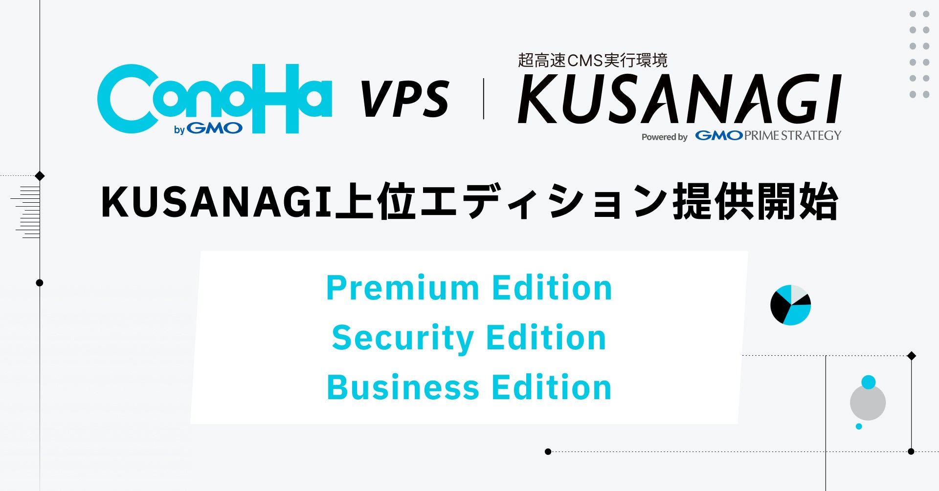 GMOインターネットグループのGMOインターネット株式会社(代表取締役 社長執行役員:伊藤 正 以下、GMOインターネット)が提供する『ConoHa VPS byGMO』(URL:https://vps.conoha.jp/)は、2026年3月17日(火)より、GMOプライム・ストラテジー株式会社(代表取締役社長:吉政 忠志 以下、GMOプライム・ストラテジー)が開発・提供する超高速CMS実行環境「KUSANAGI」(URL:https://kusanagi.tokyo/)の3つの上位エディションの提供を開始しました。