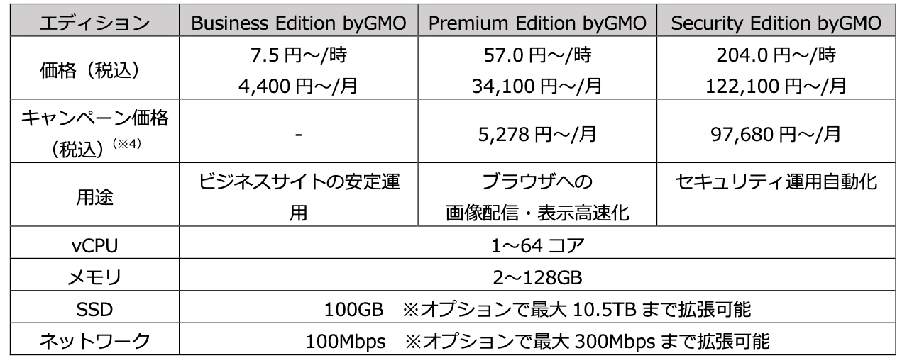 なお、KUSANAGIの上位エディションをライセンス費用込み・1時間単位で利用できる国内ホスティング事業者は『ConoHa VPS byGMO』のみです(※2)。また、本日より4月30日(木)16:00まで、一部エディション(Security Edition/Premium Edition)がお得な価格でご利用いただけるキャンペーンを実施いたします。詳しくは、『ConoHa VPS byGMO』のページ(URL:https://vps.conoha.jp/kusanagi/)をご覧ください。