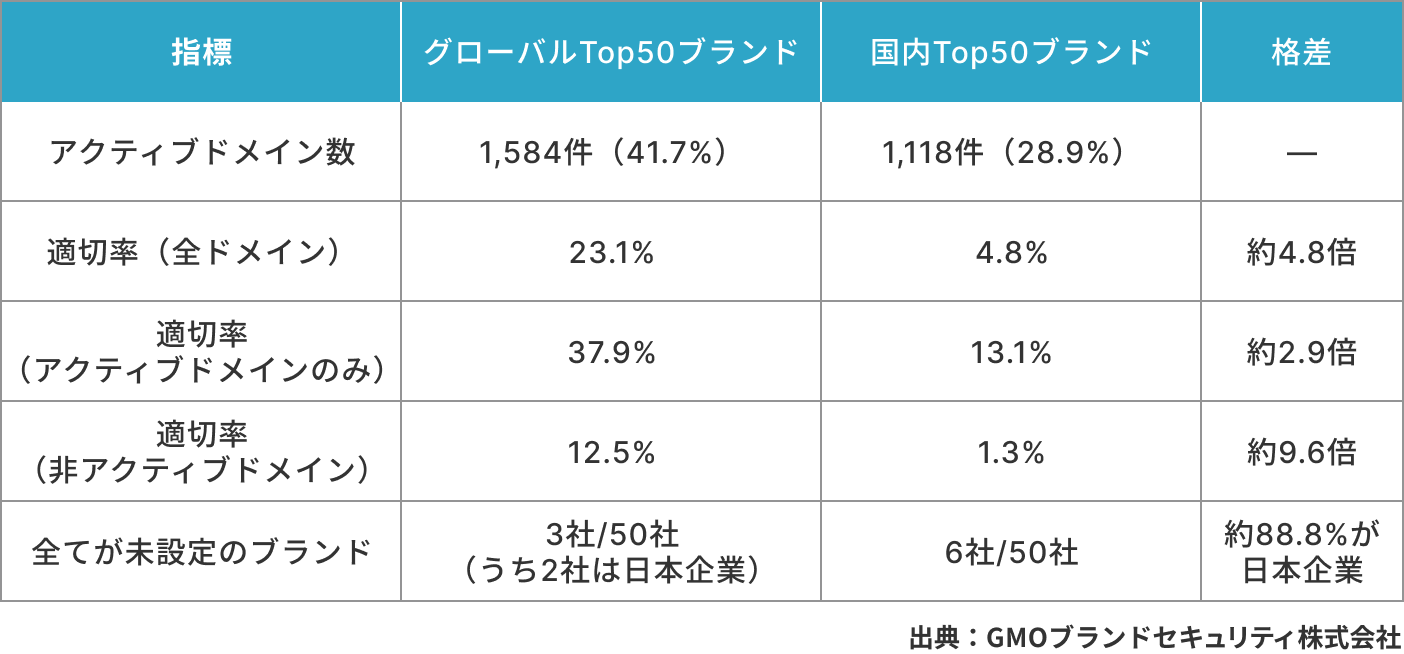 GMOインターネットグループのGMOブランドセキュリティ株式会社(代表取締役社長:中川 光昭、以下「GMOブランドセキュリティ」)は、Interbrand Best Global Brands 2025およびBest Japan Brands 2025に選出されたグローバルTop50ブランドおよび国内Top50ブランドが保有する計7,600ドメインを対象に、なりすましメール対策技術である『SPF(※1)』および『DMARC(※2)』の導入状況に関する調査を実施いたしました。