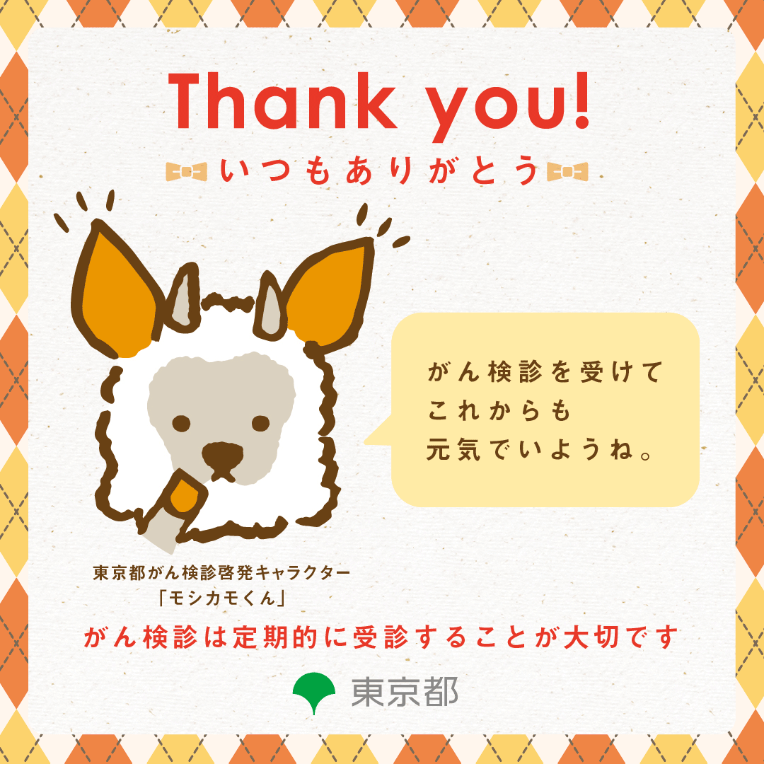 がんの早期発見のため、東京都がん検診啓発キャラクター「モシカモくん」のイラストで、がん検診受診を呼びかけるメッセージカード及びアニメーション付きメッセージ画像を作成しました。ぜひご利用ください!