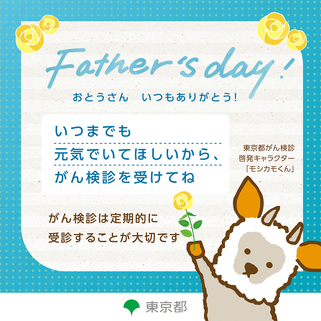 東京都では、がん予防・がん検診受診率向上のため、6月15日の父の日にあわせ、がん検診の大切さを伝える「父の日キャンペーン」を実施します。いつまでも元気でいてほしいお父さんにメッセージカードを贈り、がん検診の大切さについて一緒に考えてみませんか。