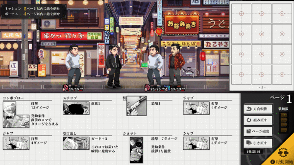 本作最大の特徴は、毎ターン配られる「コマ」をページに配置することが、そのターンの行動を決定することです。「コマ」は打撃、銃撃、移動、防御など様々な効果を持ち、ページに配置するとマンガの読み順に従って発動します。コマの形と効果を見極め、最適な1ページを組み上げていく「マンガ構築バトル」が本ゲームの醍醐味です。
