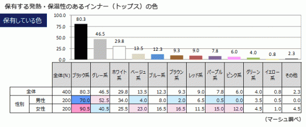 色や柄のバリエーションが豊富になったが、インナーとして普及したアイテムは、男女ともに「色物」より「ベーシックなカラー」、「柄」より「無地」と、着回しを意識している人が多く、流行色やトレンドが大きく影響したり、単体として楽しむ程のファッションアイテムになるには、「インナー」の概念そのものに、変化が必要なのかもしれない。