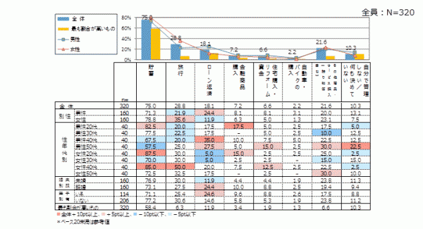 予定で最も多かった「貯蓄」の割合は、ボーナスの「3〜5割未満」が21%、「ほとんど全て」が19%であった。女性50代は「ほとんど全て」が高く、反対に女性40代では貯蓄する金額は低めの傾向がみられる。