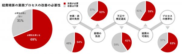 本調査により、中堅中小企業の約8割が直接費同様、間接費に関する業務プロセスの改善が必要であると感じていることが判明。特に経費精算業務、請求書支払業務においては、約7割が業務プロセスの改善が必要と回答。出張手配については、不正・違反防止のためのプロセスの厳格化と、手配の効率化という相反する課題を抱える企業が多数あることが分かりました。