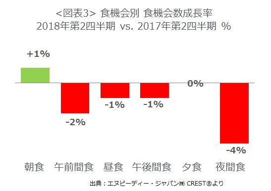 食機会別の成長率(図表3)をみると、朝食のみ増加で、1%増となりました。好調の朝食は、ファストフードの伸びがけん引しました。全体の1/3を占める昼食は1%減で、ファミリーレストランの平日利用や社員食堂の利用減が影響しました。