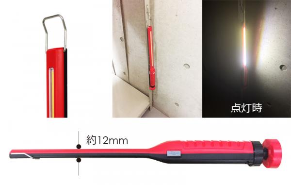 ライト部分の厚みが約12mmのため、車両下やエンジンルームなど、狭いスペースでの作業に便利。