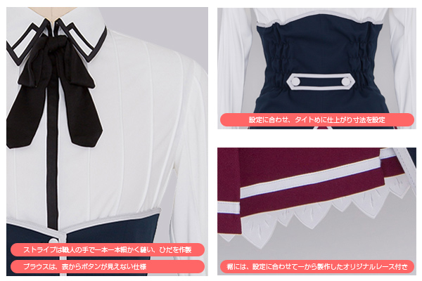 公式監修のもと、設定に合わせて製作したスカートのレースや、優雅なケープが着崩れしないよう配慮したブラウス後衿のボタンなど、細部にまでこだわり、落ち着いた色合いで品のある制服を丁寧に製作。