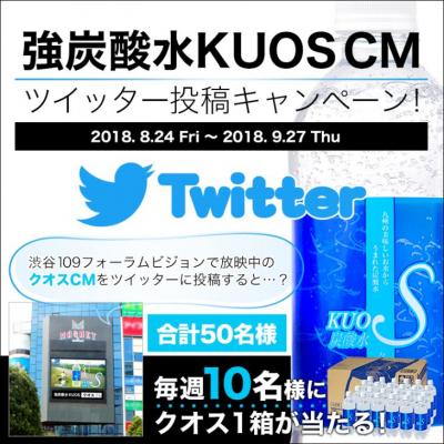 毎週先着で10名様に、渋谷109フォーラムビジョンで放映中の『KUOS-クオス-』のCMを動画で撮影しTwitterに投稿した方に『KUOS-クオス-』1箱(500ml×24本入り)をプレゼントします。