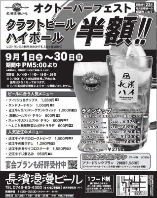 長濱浪漫ビールでは2018年9月1日(土)から30日(日)まで、クラフトビールやハイボールが半額になる「オクトーバーフェスト」を開催いたします。