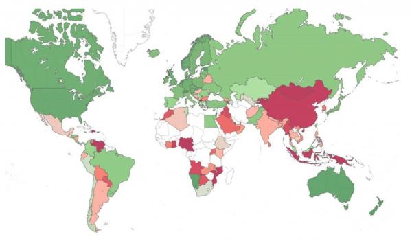 次の地図は、世界各地のリスク指標を示しています(緑 - 低リスク、赤 - 高リスク、灰色 - データ不足)。特にリスクの高い地域やマルウェア感染が多数発生している地域を確認できます。