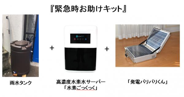 今回、リニューアル販売を開始する『緊急時お助けキット』は、高濃度水素水サーバー「水素ごっくっく」・「水素ごっくっくmini」(別売)をご利用されているご家庭・企業等において、太陽光発電システム「発電バリバリくん」を組み合わせることで、災害時でも電力と安全な水を確保するためのアドオンキットです。災害発生直後にこれらのライフラインが途絶した際に、「水素ごっくっく」・「水素ごっくっくmini」を使用して風呂水や雨水などの飲めない水から飲料水を生成することができます。リニューアルパッケージでは雨水の貯蓄とその浄化にウエイトを置き、185リットルの雨水タンクをセットしました。