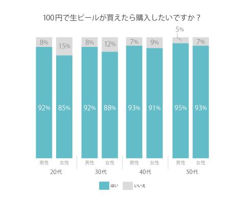 今回の調査では、20代から50代の男女6,697人を対象に100円生ビールについてのアンケートをインターネットで実施。その結果、20代から50代のすべての性別・年代で、「100円で生ビールが買えたら購入したいですか?」という質問に対し「はい」と答えた人が85%以上、という結果になりました。