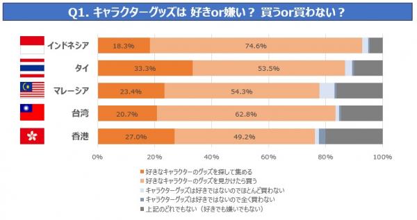 一方で、「キャラクターグッズは好きではないのでほとんど買わない」「キャラクターグッズは好きではないので全く買わない」と答えた人の合計は、マレーシアの6.1%が最も多く、台湾にいたっては1.9%。やはり、ほとんどの人がキャラクターグッズ好きということがわかります。
