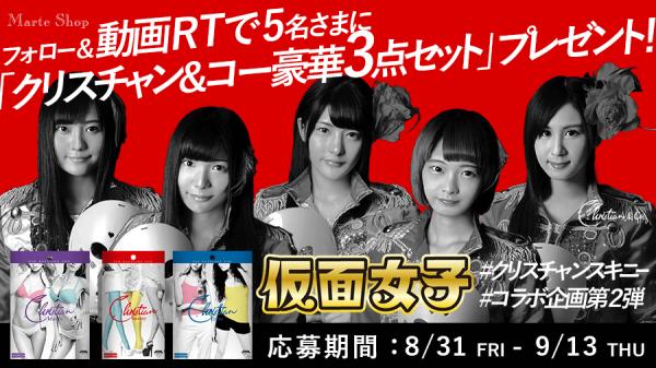 最強地下アイドル「仮面女子」と自社通販サイト“マルテショップ”の主力商品である「クリスチャン・スキニー」のコラボ動画リツイートキャンペーンを開催致します。Twitterのフォロー&動画視聴、リツイートだけで、クリスチャン&コー豪華3点セットの当選チャンス。本日8/31(金)より応募開始致します。