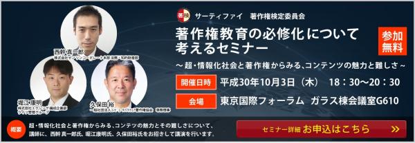 株式会社サーティファイ 著作権検定委員会(以下「サーティファイ」、本社:東京都中央区、代表取締役社長:国山 広一)は、2018年10月3日(水)に東京・丸の内の「東京国際フォーラム」にて、『著作権教育の必修化について考える 〜超・情報化社会と著作権からみる、コンテンツの魅力とその難しさ〜』と題するセミナーを開催します。近年、コンテンツ大国である我が国においては、国際競争力強化を目的とした、知的財産権(著作権)に精通した人材育成が急務となってきています。サーティファイ著作権検定委員会では、超・情報化社会と著作権からみる、コンテンツの魅力とその難しさについて、又それに伴い「著作権教育」がどのような影響をもたらすかについて、講師に株式会社ゼンリン 西幹 真一郎 氏、株式会社エクシング 堀江 康明 氏、一般社団法人コンピュータソフトウェア著作権協会専務理事 久保田 裕 氏をお招きして、ご講演いただきます。
