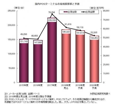 【矢野経済研究所プレスリリース】POSターミナル市場に関する調査を実施(2018年)-2017年度の国内POSターミナル市場は、前年度比152.8%の22万6千台、同157.3%の763億円と急拡大-