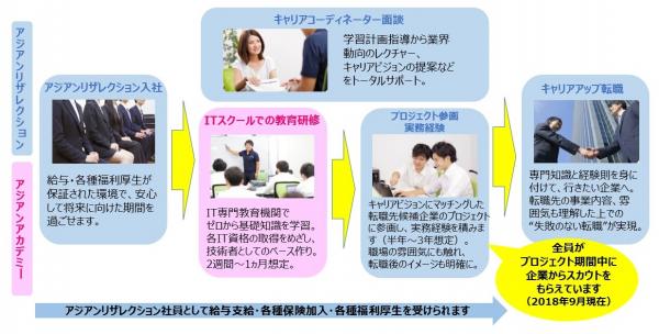 まず最初に、参加者は当社に入社し社員として雇用され、給与や各種保険など福利厚生を保証されます。その後、当社と同じく株式会社アジアンリンクグループ傘下にあるIT専門教育機関・株式会社アジアンアカデミーにて、IT技術者として必要な知識や技能をゼロから学習します。