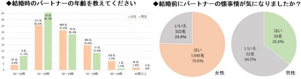 まず「結婚時のパートナーの年齢を教えてください」と尋ねたところ、男女共に「25〜29歳」が最も多く、次いで「30〜34歳」、「35〜39歳」という結果になりました。