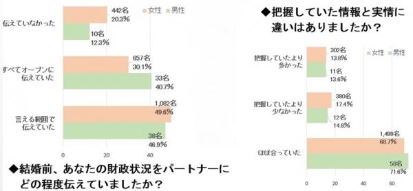 「結婚前、あなたの財政状況をパートナーにどの程度伝えていましたか?」と尋ねたところ、「すべてオープンに伝えていた」と答えたのは女性3割、男性4割でした。2割以上の女性は「伝えていなかった」と答えていますが、約半数は男女共に「言える範囲で伝えていた」と答えています。